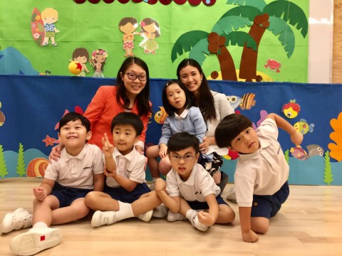 K2、K3混龄上课,两位老师分别以广东话、英语讲有关海洋生物的故事。期间,有学生发表意见,说出Tsunami(海啸)、Typhoon (颱风)等词彙,英文程度可见一斑。「在我们学校,英文并不是学科,不少家长会问我们,英文每星期佔几多堂,事实上,我们学校的英文,是每天生活上要应用的工具。」